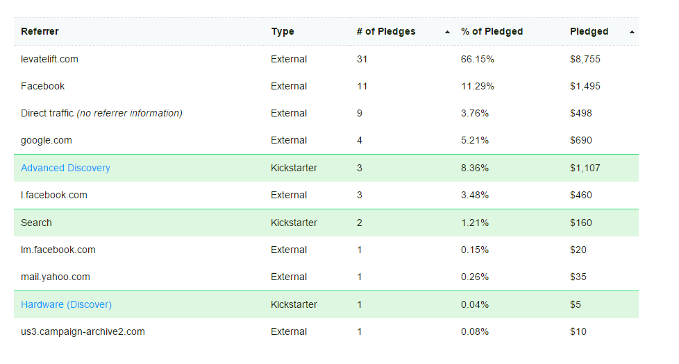 In a famous article on Hacking Kickstarter, the author wrote that for them, twitter and facebook were the biggest sources of contributors. Interestingly enough, that was not the case for us. As you can see, Twitter doesn't even figure on the list, and Facebook was only responsible for 11% of our total contributions. Instead, half of our contributors and 66% of the total amount came from our website. That meant that it came from our direct outreach via email, Facebook messages, and the like. We know this because we typically sent our direct contacts to a landing page on levatelift.com, that then had a link to the Kickstarter.
